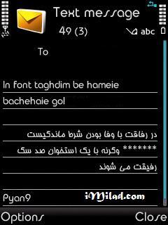 این فونت که شامل فونت فارسی خودکار نیز می باشد نمای بسیار جالبی به گوشی شما و خصوصا بخش اس ام اس های آن می دهد و بیشتر به دوستان اس ام اس باز توصیه می شود. فونت فارسی این پکیج فونت دست نویس خودکار می باشد . برای نصب این فونت روی گوشی کافی است که این فایل را اینجا  دانلود و بعد از اکسترکت کردن فایل های درون آن که شامل 2 فایل FontRouter.ini و فایل فونت می باشد آن را به مسیر E:/Data/Fonts درون گوشی خود انتقال داده و سپس گوشی خود را یک بار خاموش و روشن نمایید. بعد از روشن شدن گوشی مشاهده خواهید کرد که فونت های گوشی شما در تمامی قسمت ها به صورت زیر در آمده است و همانطور که مشاهده میکنید فونت فارسی و انگلیسی گوشی شما عوض شده است: